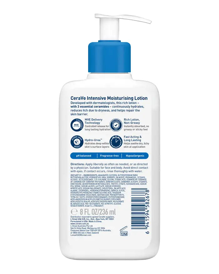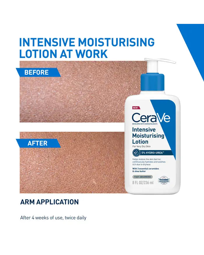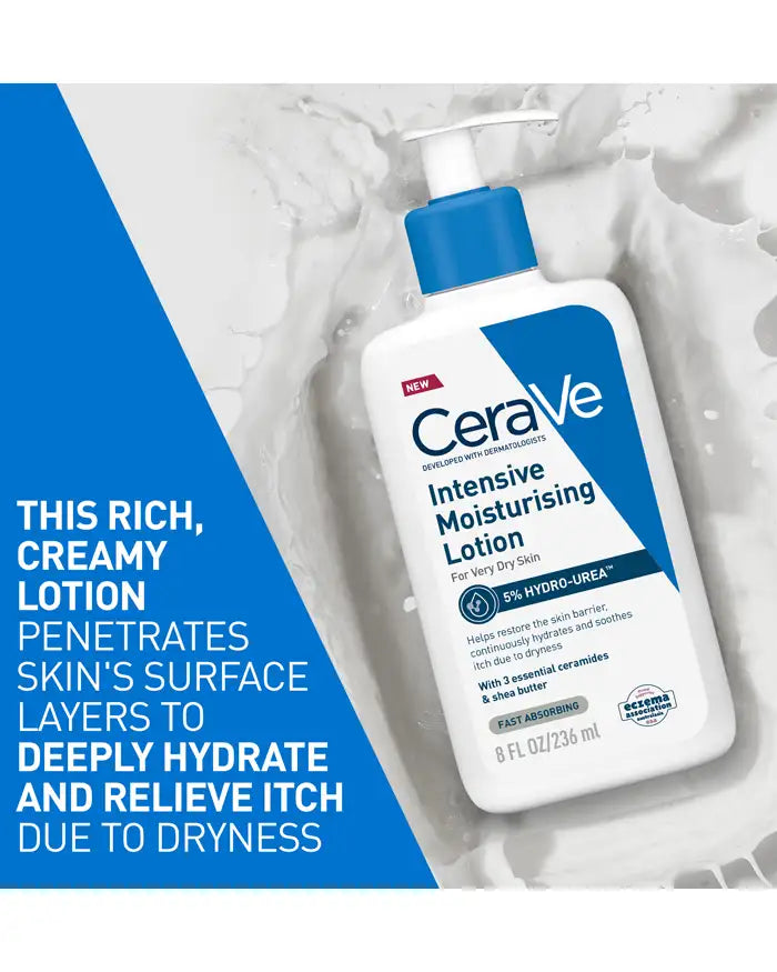 CeraVe Intensive Moisturising Lotion is a hydrating body lotion for extra dry skin. Formulated with with three essential ceramides, MVE Delivery Technology, and NEW Hydro-Urea® Technology that helps strengthen & maintain the skin moisture barrier.